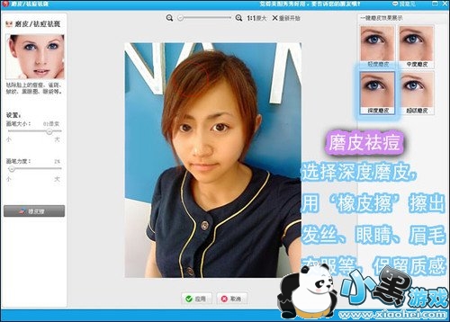 3、大致的脸形处理出来后,在选择“磨皮去痘”功能对人物的皮肤进行处理,如图4所示,执行“深度磨皮”项后,再选用“橡皮擦”功能对人物的发丝、眼睛、眉毛、衣服处进行涂沫,这样可以保留原图的质感,不至于失真!