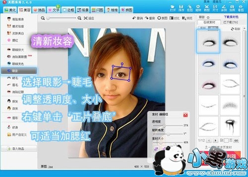 4、轮廓大致已OK了,可是素颜的MM,总有一些没有气色,这时就可以用美图秀秀的眼影、睫毛或是腮红等彩妆功能进行添加了,如图5所示。