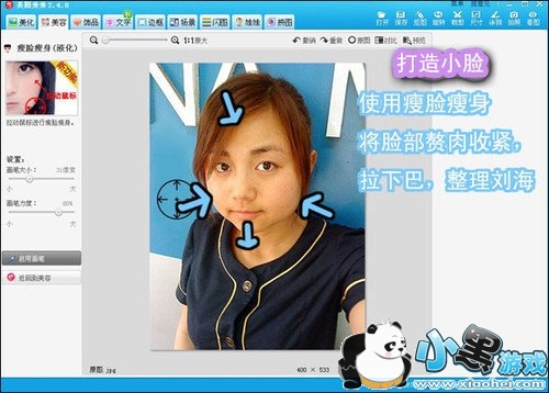 2、脸形美化后,再用“瘦脸瘦身”和“眼睛放大”功能对人物的五官进行略微的美容,如图3所示,注意画笔的大小和力度。