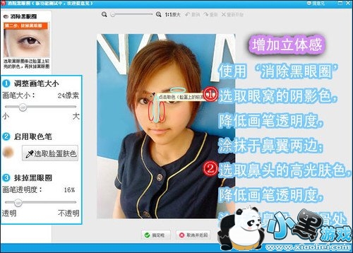 5、这样一看,人物的气色就好多啦~接下来就是细节的优化了,选择“消除黑眼圈”功能,增加五官的立方体感,如图所示。