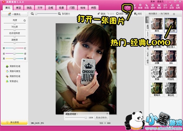 第一步:在“美图秀秀”软件下打开一张手机照。由于这张照片人物偏暗的缘故,我们选择“热门”分类下的“经典LOMO”特效。这样能够增加暗角特效,一下子就让主体人物变得突出了。