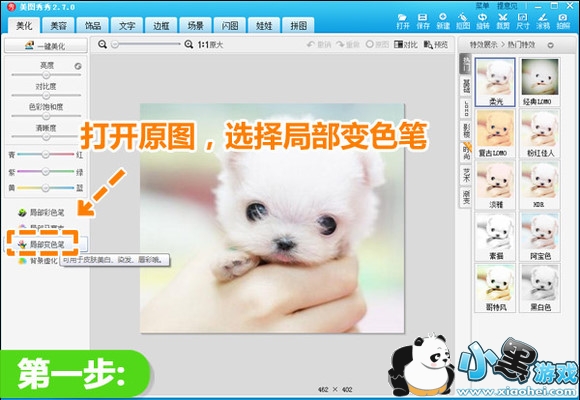 1.打开一张宠物图片后,在“美化”菜单下,选择左侧栏的“局部彩色笔”。