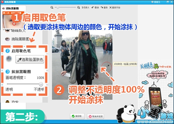 2、在跳转出来的界面中,先启用“取色笔”,在路人周围取色,并将画笔透明度调为100%,开始在路人身上涂抹。原理就是用周边景色来取代路人,所以修复过程中要在周边不断的取色来反复涂抹。