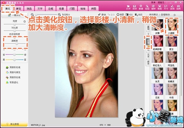 1.用“美图秀秀”打开照片后,在“美化”菜单下选择“影楼—小清新”特效,在左侧稍微将清晰度稍微调大一点,提亮画面。
