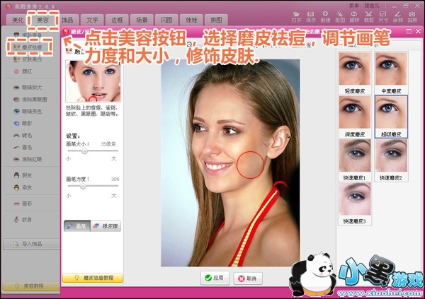 2.接着在“美容”菜单下,选择“磨皮祛痘”功能,调整画笔的大小与力度,修饰皮肤。