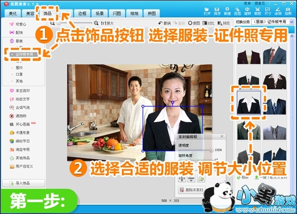 第一步:在“美图秀秀”软件下,打开一张自己的正面生活照。进入“饰品”菜单下,选择“服装—证件照专用”,给自己挑件合适的衣服,再适当的调节服装的大小和位置。