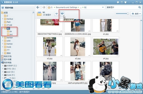 美图看看在找图方面的“功力”也相当深厚。比如一个图片文件夹下又有多个子文件夹时,用美图看看的“一键穿透文件夹”功能,即可快速揪出所有目录中的图片,摄影师挑选满意的街拍作品当然就更方便啦!示意如图02所示: