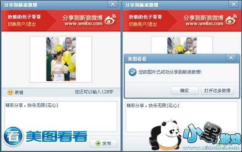 直接用新浪微博账号登陆,写一点想说的话即可发布啦!完成发布后美图看看也提供了直接打开此条微博的快速通道,我们可以很便捷的直接进入网页查看,如图04所示。