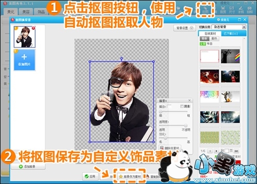 1.在“美图秀秀”中打开一张小猪的照片,选择“抠图—自由抠图”抠取人物后,点击“前景作为素材”按钮。并以同样方法再抠取一张照片存为素材。