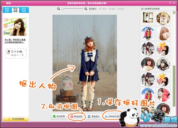 第二步:在跳转出来的抠图界面中,将人物抠取出来,很简单,只需用鼠标绕人物一周即可。抠好后别忘记点击“保存抠好图片”,将抠好的图保存到电脑中。
