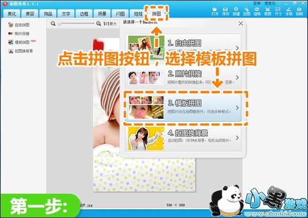 1、在“美图秀秀”软件下打开一张宝宝的照片,进入“拼图”菜单下,选择模板拼图。