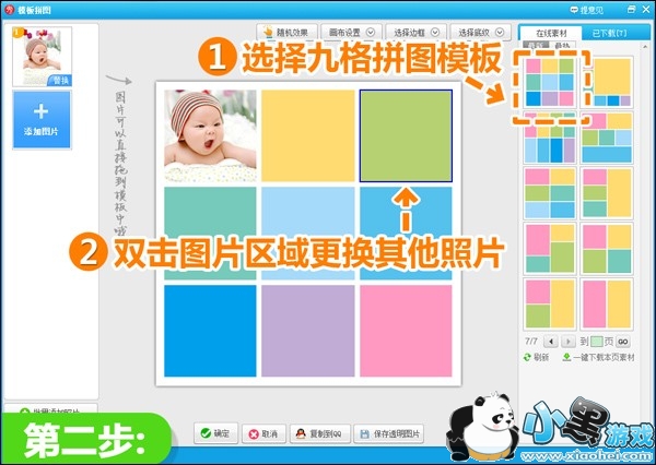 2、在跳转出来的新界面中,选择九格拼图模板,并双击一些图片区域更换其他的照片。