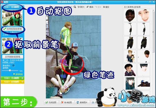 2.进入抠图编辑界面后,选方法1:自动抠图,然后单击“抠取前景笔”并用绿色笔迹涂抹需要保留的部分(即为除墙面以外的前景,为了之后还原被涂鸦覆盖的前景部分)。