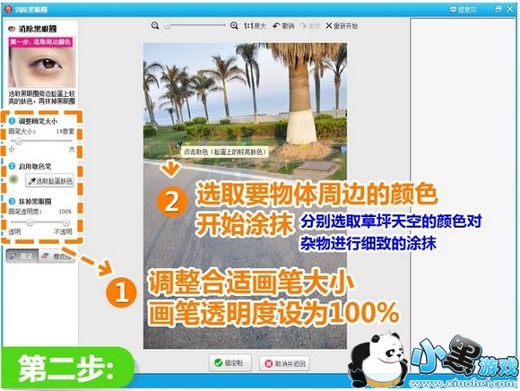 2、接着调整合适的画笔大小,画笔透明度设为100%。先想好要剔除的杂物,选取这些物体周边的颜色开始涂抹。在这幅图中,分别选取草坪天空的颜色进行细致的涂抹。