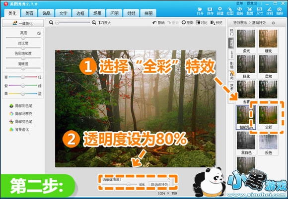 2.接着,选择“全彩特效”,透明度设为80%,恢复景物原来的色彩。