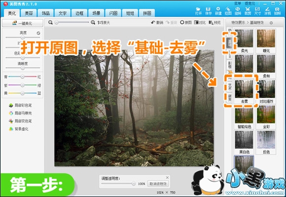 1.在“美图秀秀”软件中打开原图后,选择“美化—基础”下的“去雾”特效。