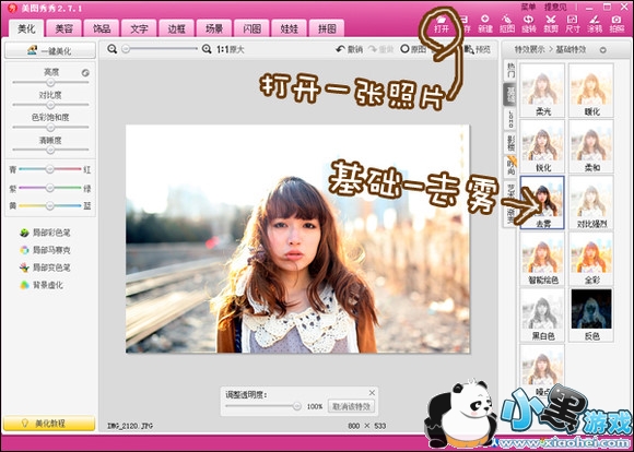 第一步:在“美图秀秀”软件下打开原图,在“美化”菜单下,选择“基础”分类下的“去雾”特效。可以一键去除那如薄雾的阳光,让主体人物更加突出。