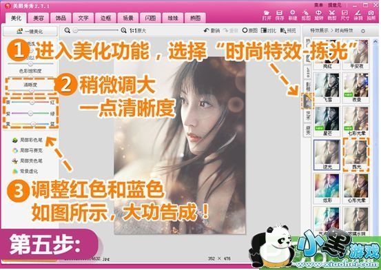 第五步:选择"时尚特效-拣光",然后稍微调大一点清晰度,再调整红色和蓝色,调整的位置如图上如示,就大功告成啦。