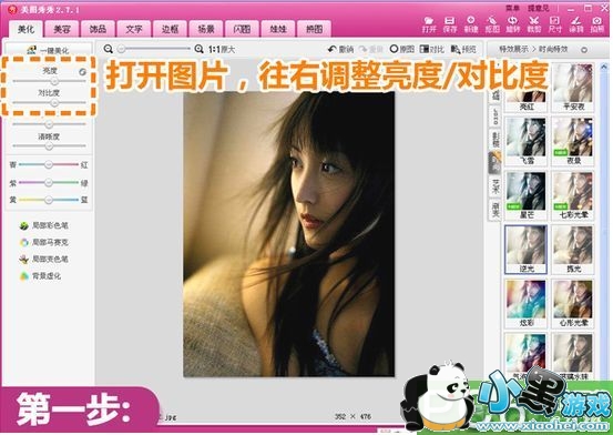 第一步:在"美图秀秀"软件中打开图片,然后往右调整"亮度/对比度",调到合适的位置,让照片不显得暗沉。
