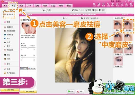 第三步:点击"美容"菜单下的"磨皮祛痘",选择"中度磨皮",去除脸上痘斑等,让自己的脸得光滑如玉,整张照片更显柔和。