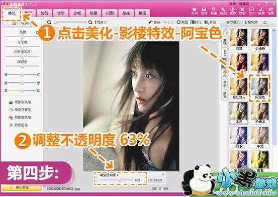 第四步:点击"美化"菜单的"影楼"特效,选取"阿宝色",然后在照片下面调整不透明度到63%。