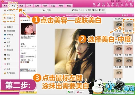 第二步:点击"美容"菜单的"皮肤美白",然后选择"美白-中度",再点击鼠标左键,涂抹出需要美白的区域。