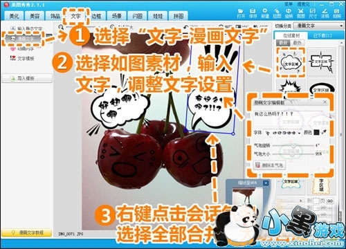 3、点击“文字”菜单下的“漫画文字”,选择如图素材,输入文字并调整文字的位置。最后,用鼠标右键点击会话气泡,并选择“全部合并”。