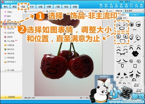 2、打开“饰品”菜单下的“非主流印”,选择两个合适的表情拖到樱桃上面,再适当调整表情的大小和角度,直到与原图契合。