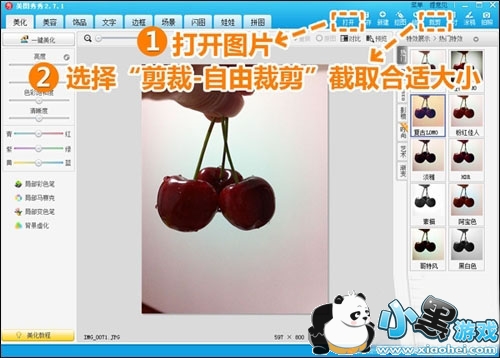 1、在“美图秀秀”软件中打开一张樱桃图片,为了突出作为“主角”的樱桃们,首先要选择“裁剪—自由裁剪”,截取合适的大小。