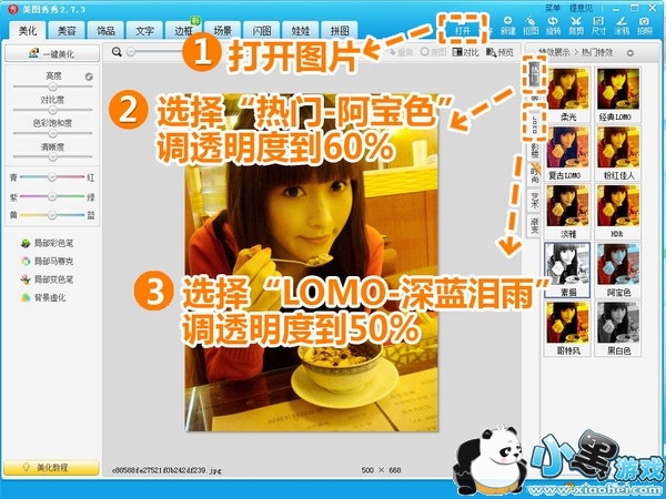 第一步:在软件下打开待处理的照片,在“美化”菜单下,选择“热门特效-阿宝色”,透明度调整为60%;接着选择“LOMO-深蓝泪雨”,透明度调整为50%。使人物肤色接近正常白皙。