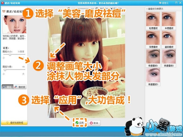 第三步:再进入“美容”菜单,点击“磨皮祛痘”,在左侧调整合适的画笔大小,涂抹人物头发部分,减少噪点。最后点击“应用”,再保存,就大功告成啦!
