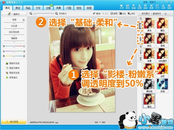 第二步:选择“影楼-粉嫩系”特效,透明度调整为50%;然后选择“基础-柔和”特效。打造柔美肤色。