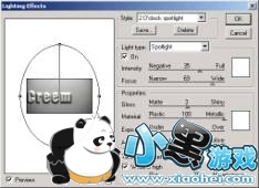 3.在Channel面板激活bitblue1通道。执行Filter/Blur/Gaussian Blur,值为4 pixels。选择RGB通道,然后载入bitblue2通道,反选选区,按下Delete键。执行Filter/Render/Lighting Effects,参数如图:其中color和Ambient color全为白色。