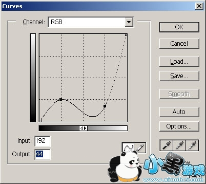 选择Image / Adjust / Curves,在弹出的窗口里,用左键在图7的位置建立两个新点,