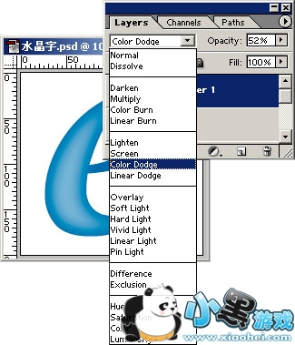 选择白色为前景色,然后按layer / new / layer新建一个图层,取名layer1,按alt + 后退键填充该选区。然后按ctrl + D取消选区。选择filter / blur / Gaussian blur,选择参数为16。然后再次执行Gaussian blur命令,选择参数为8。再次执行该命令,选择参数为4。然后选择该图层的Opacity为52%,图层属性下拉菜单处选择为color dodge。如图3所示。