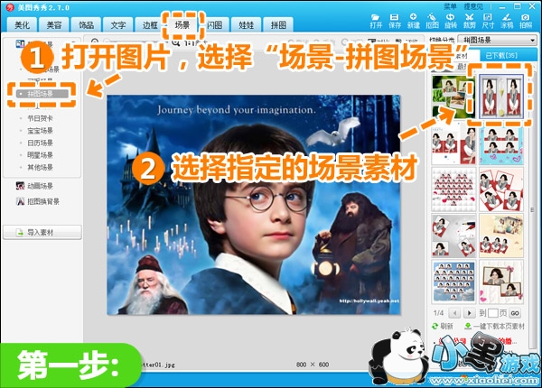 1、在“美图秀秀”中打开原图,进入“场景”菜单下,选择“拼图场景”,挑选一个合适的场景素材。