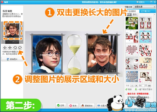 2、在进入拼图场景后,双击每一个图片区域进行更换图片,接着在左侧选框中调整图片显示的位置和大小。