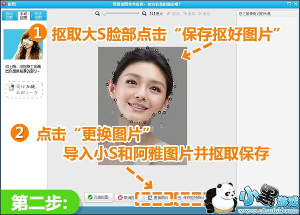 2.进入抠图界面后,选用“手动抠图”抠取大S的脸部并保存抠好的素材,点击“更换图片”,导入小S和阿雅的图片并也抠取脸部保存。完成后点击“完成抠图”。