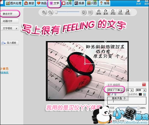 打开原图写上很有feeling的文字,文字模板里也有哦,亲们也可以键入静态文字。