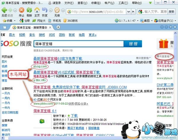 笔者在soso中搜索“简单百宝箱”发现前面三条全部指向木马病毒,并且这些搜索结果全部标注“腾讯搜索推广”,这些网站只要用户点击就有可能被盗取腾讯QQ及其关联的DNF等热门游戏帐号。鉴于腾讯soso部分推广链接已遭木马利用,pc6小编提醒各位应谨慎点击,并使用安全软件保护帐号。