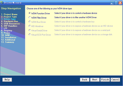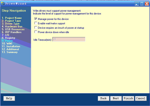 9、对WDM支持的电源管理选项进行选择。WDM驱动程序必须支持电源管理,电源管理器使用IRP指示驱动程序来改变电源状态、等待并响应系统唤醒事件和查询驱动程序的设备。