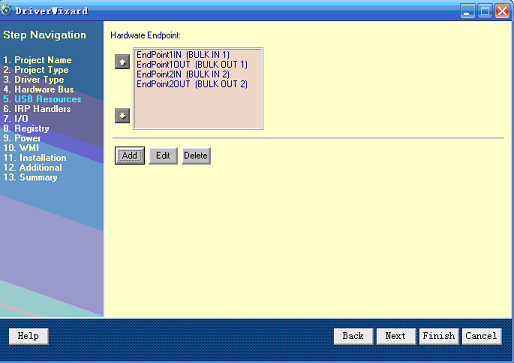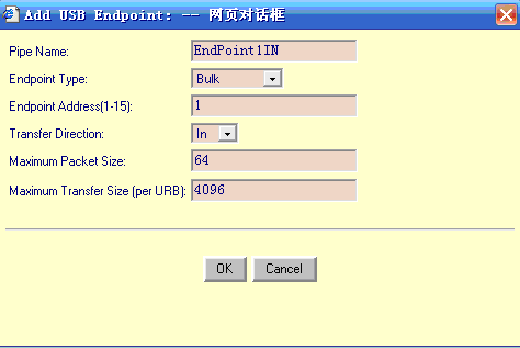 5、在接下来对话框中(如5),我们需要加入Endpoint1和Endpoint2定义。由于在USB中规定Endpoint0是必须存在,所以我们不需要对Endpoint 0进行定义。在生成的驱动程序设备类中KusbLowerDevice的实例m_Lower就代表了端点0(Endpoint 0),可以通过m_Lower这个默认控制管道来控制USB设备,如配置USB设备、传输各自控制和状态请求等。点"Add..."按钮,弹出如图5-1所示对话框,分别添加Endpoint1和Endpoint2的读写定义。其中,PipeName指端点名称,不可重复;EndPoint Type指端点类型,可选为控制、批量、中断和同步四种;EndPoint Address指各端点的端点号,最大偏移量为15(协议规定,USB设备具有除零端点以外最多15个端点),同一端点的输入和输出端点号地址是一样的,范围从1~15。Transfer Direct指所定义的是输入端点还是输出端点;Maximun Packet Size指所定义类型的端点一次能传输的最大包大小,控制和批量端点为8163264字节,中断端点为64字节,同步端点为1023字节。此时,将在设备类头文件种添加如下代码: