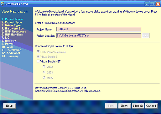 由于DriveStudio由几个部分组成,我们写这个驱动程序只要用到DriverWork。在这里,我们假定读者已经正确安装了DriverWorks,并且已经编译了各个库文件(见本博客前面介绍内容)。