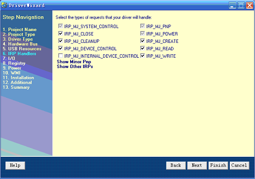 6、选择TRP处理类型。WDM驱动程序必须支持IRP_MJ_SYSTEM_CONTROL、IRP_MJ_POWER和IRP_MJ_PNP。IRP_MJ_CREATE、IRP_MJ_READ、IRP_MJ_WRITE、IRP_MJ_CLOSE、IRP_MJ_CLEANUP或IRP_MJ_DEVICE_CONTROL处理应用程序和驱动程序之间的通信工作。
