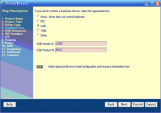 4、在第4个对话框中(如图4),选择我们驱动程序所操作总线类型。这里,我们选择USB。在USB Vendor ID和USB Product ID中填入USB设备VID和PID。假定我们USB设备VID和PID分别是16进制0471和1801。然后点按钮"Next >"。