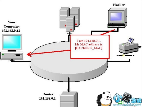 在正常情况下,计算机A,B,C,和主机通过路由器来控制上网,一般而言,比方说A要向C发送数据,那么A就要在局域网内发送数据,请问192.168.1.99的mac地址是多少,其他计算机都说不知道,然后当问到C时候,C说我的mac地址是33-33-33-33-33-33,哈哈,这样两台计算机,就能发送数据了啊,由于计算机B浏览了不正规的黄色网站(顺便说一句,其实正规的黄色网站是没有病毒的),导致中了arp病毒,然后这台B计算机开始了欺骗的道路,他把自己伪装成C的IP地址和MAC地址,然后通过一些手段把计算机C的IP地址和MAC地址伪装成局域网中的计算机E,所以当计算机A开始要向计算机C发送数据时候,计算机A要在互联网上询问一下计算机C的mac地址是多少,那么计算机B就会说,我知道,就是我,因为计算机B此时已经伪装成计算机C了,此时计算机B就开始接受计算机A的数据了,这个就是arp欺骗伪装攻击。
