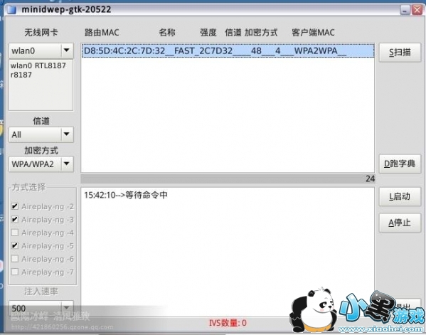 5、怎么样?嘿嘿,看到了吧?软件已经搜索到了wpa2加密的方式的路由器!当然了,软件的搜索方式是一起搜索,也就是wep,wpa2一起搜索,看看软件左边栏的“加密方式”你选择wep就会显示wep方式加密的路由,你选择wpa2就会显示wpa2方式加密的路由,咱们这儿讲的是修改wpa2加密方式的路由!所以wep一笔带过!如果是修改wep的路由,直接右边栏的“启动”按钮,剩下的几乎不用动手自动搜索密码(前提是有数据包哦!)