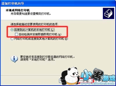 在“本地或网络打印机”窗口中,选择“连接到此计算机的本地打印机”选项,勾除“自动检测并安装即插即用打印机”选项,然后点击“下一步”按钮。如图 2 本地或网络打印机所示: