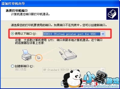 在“选择打印机端口”窗口中,从“使用以下端口”下拉列表中选择 USB 端口,然后点击“下一步”按钮。