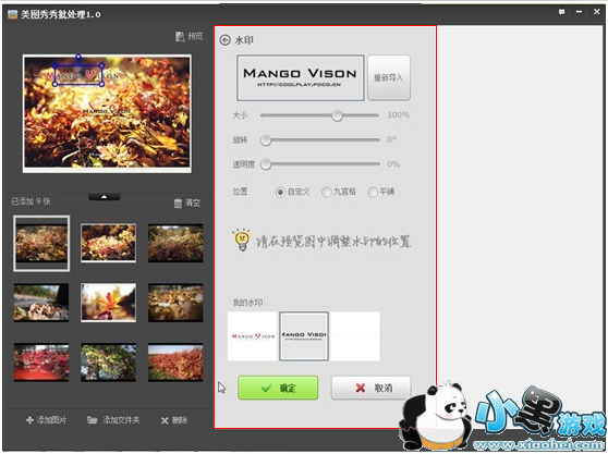 通过批处理工具的水印功能,我们能够对水印的大小、旋转、透明度以及水印位置进行自由控制,同时,在调节水印的时候,可以轻松预览,即时看到水印效果;此外,该工具有记忆功能,之前导入过的水印都留存在水印功能板块的下方,方便随时调用。如上图。